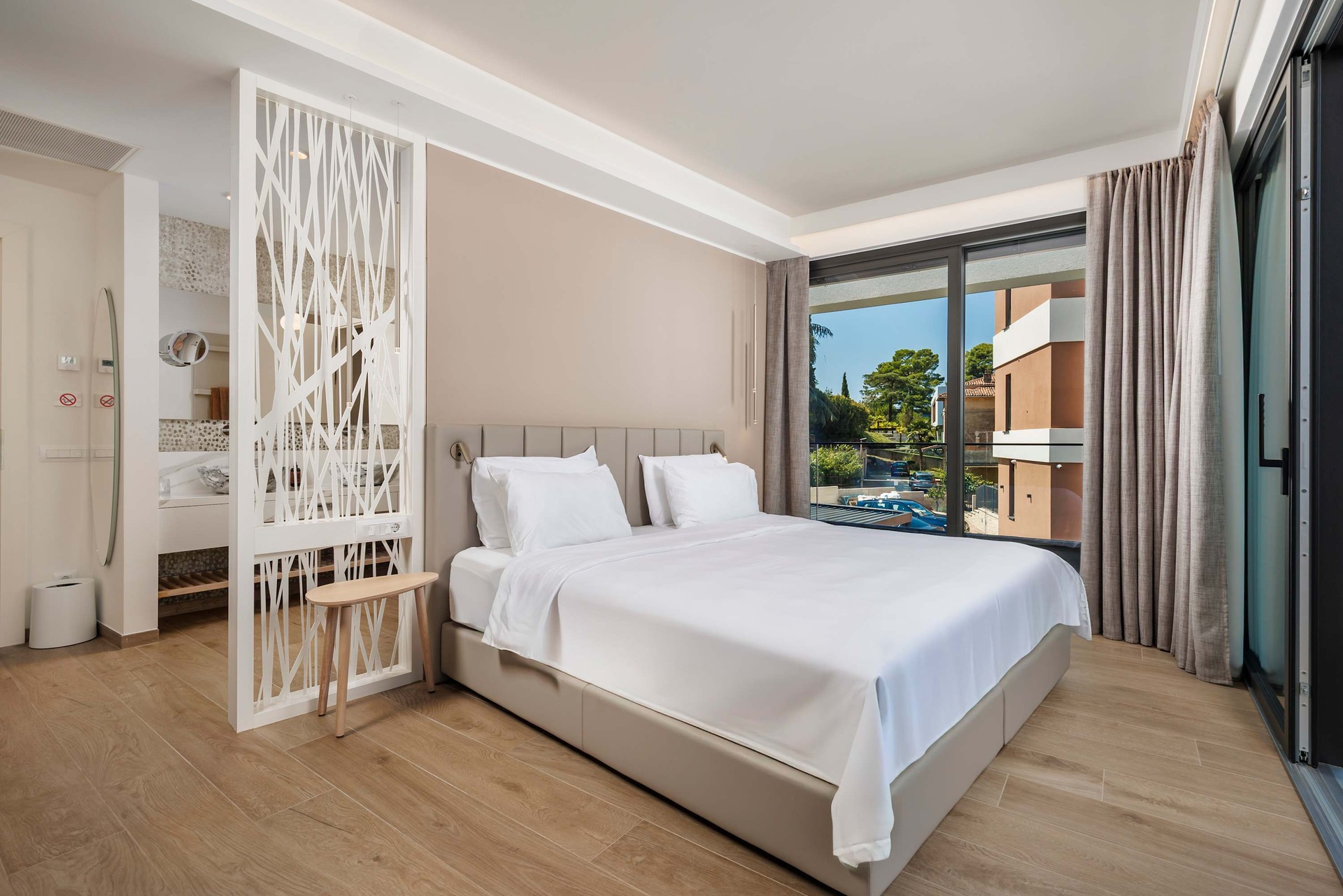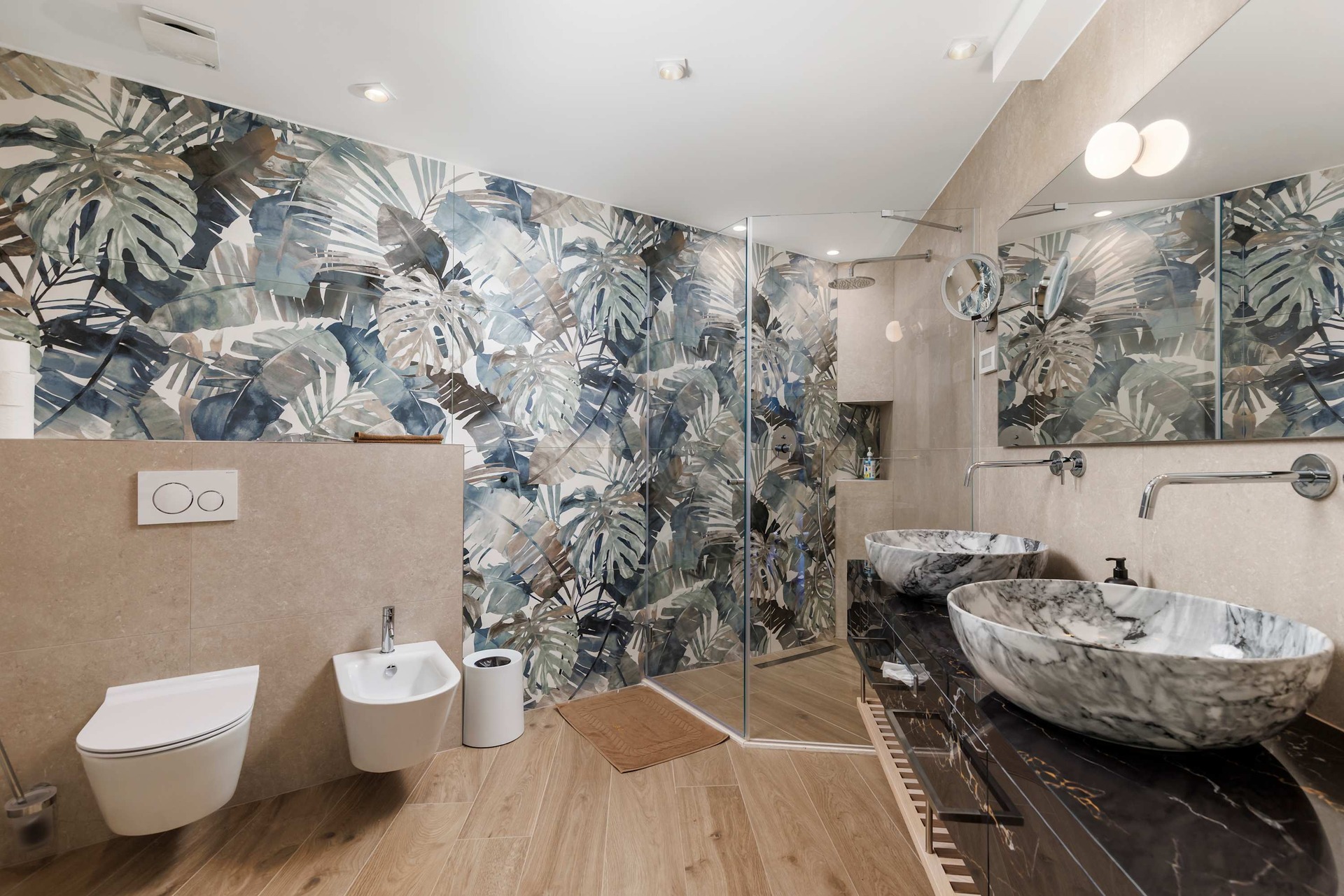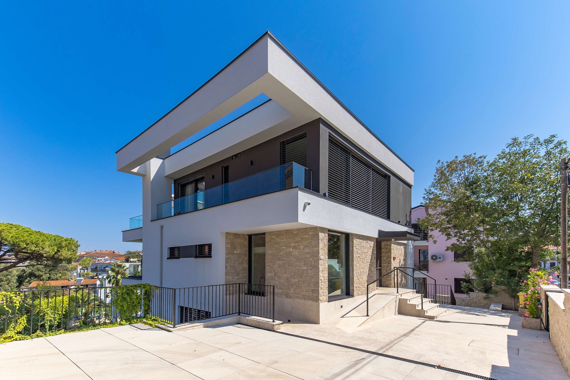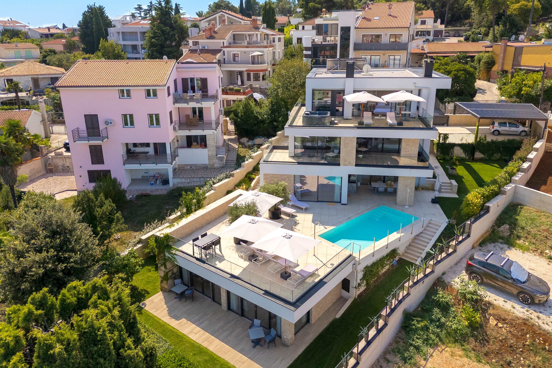 Villa Albion is a luxurious 5-bedroom retreat in Rovinj, designed for guests who value privacy, comfort, and elegance. Ideally located within walking distance of the old town, marina, and popular beaches like Mulini, this exclusive villa offers a peaceful haven close to the Adriatic coast’s finest attractions. Each of the five spacious bedrooms includes a king-size bed, en-suite bathroom, Smart TV, minibar, safe, and access to a private terrace with scenic views. The outdoor area is perfect for relaxing and entertaining, featuring a heated infinity pool, Jacuzzi, Finnish sauna, sun loungers, and umbrellas.