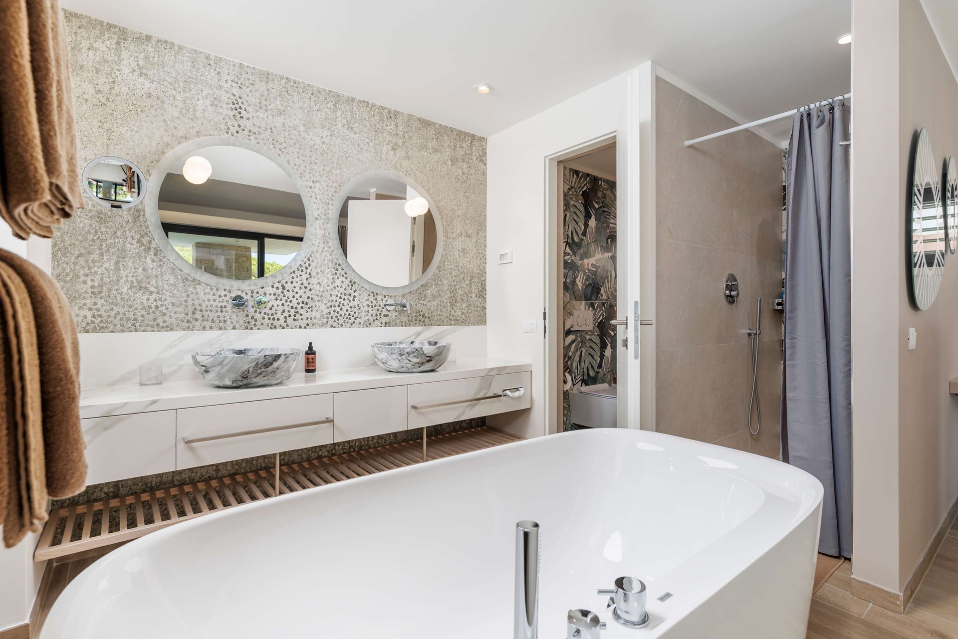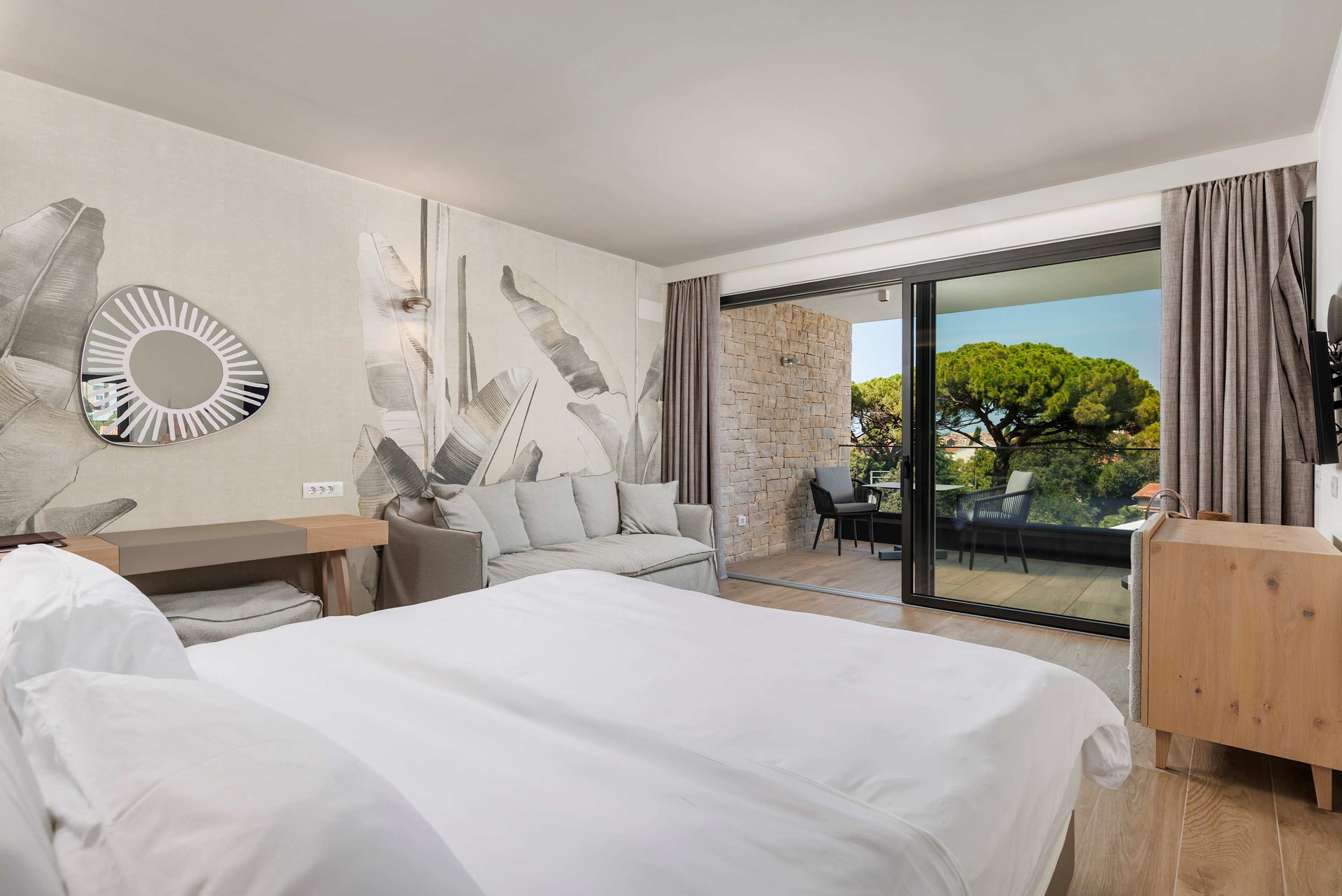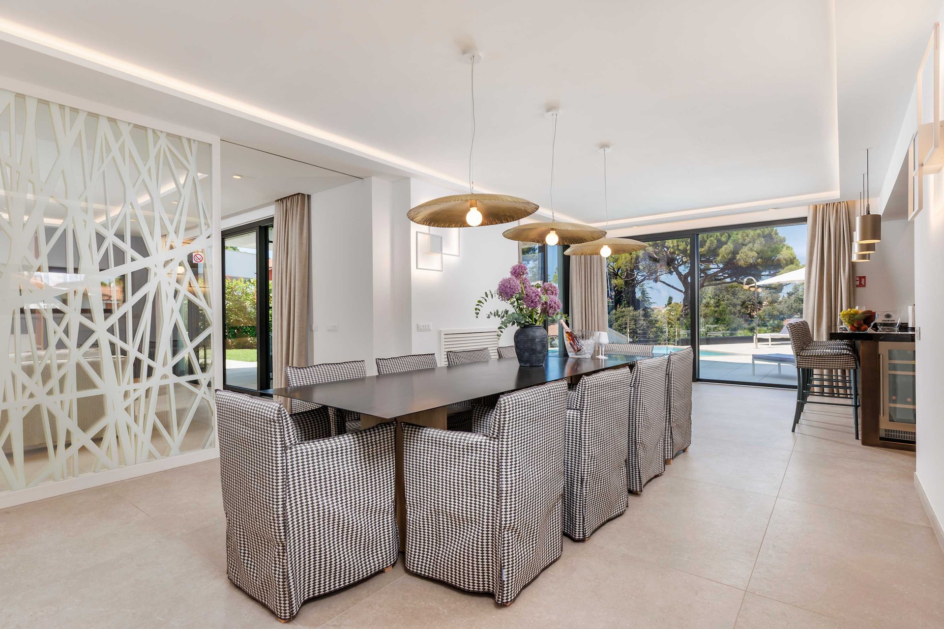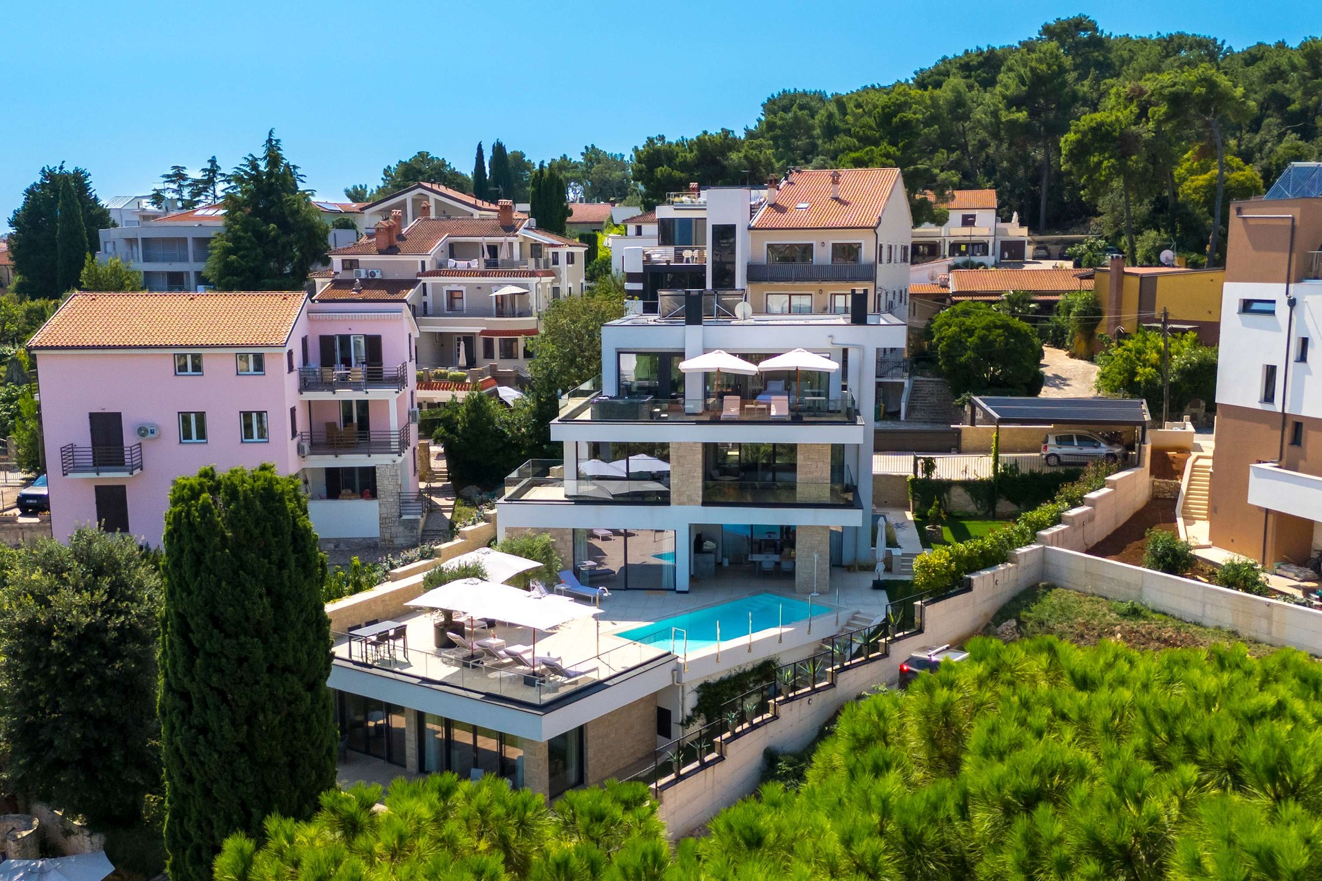 Villa Albion is a luxurious 5-bedroom retreat in Rovinj, designed for guests who value privacy, comfort, and elegance. Ideally located within walking distance of the old town, marina, and popular beaches like Mulini, this exclusive villa offers a peaceful haven close to the Adriatic coast’s finest attractions. Each of the five spacious bedrooms includes a king-size bed, en-suite bathroom, Smart TV, minibar, safe, and access to a private terrace with scenic views. The outdoor area is perfect for relaxing and entertaining, featuring a heated infinity pool, Jacuzzi, Finnish sauna, sun loungers, and umbrellas.